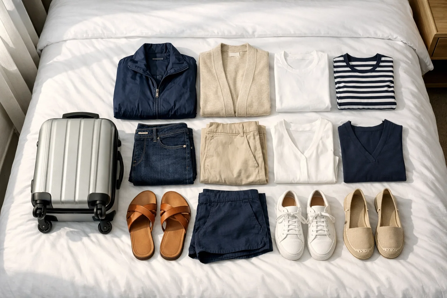 Warm months get a specific exception: pack walking sandals that can do real mileage and still look polished at dinner. Think clean leather, secure straps, supportive footbed. No foam flip-flops. No flimsy slides.