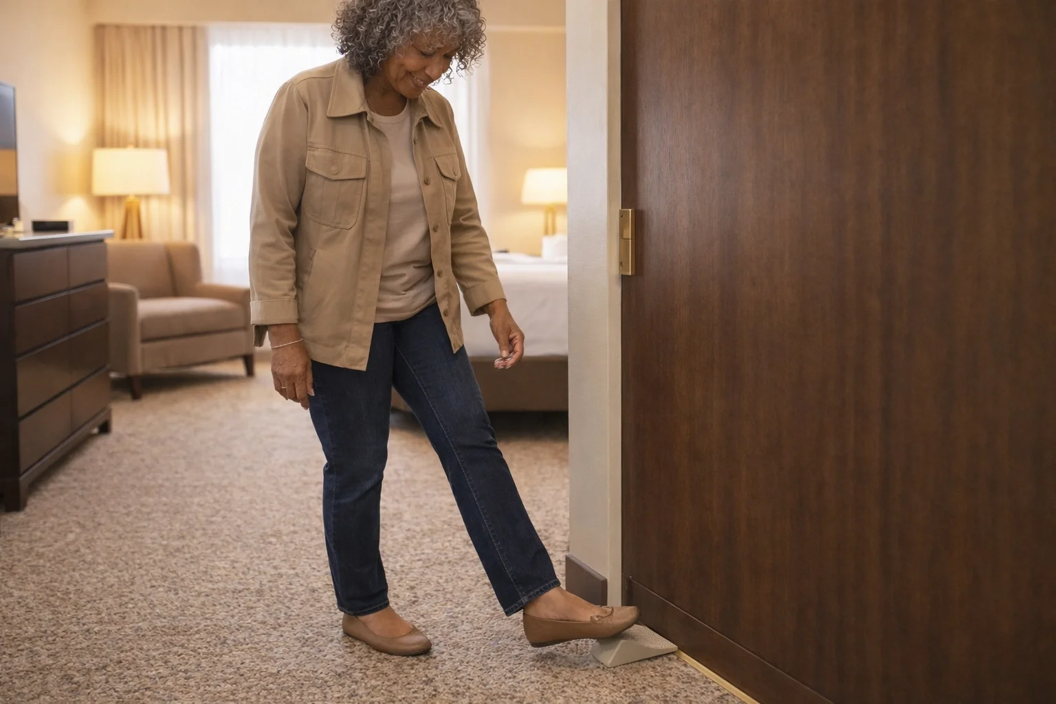 Some women travel with a rubber doorstop — wedged under the door at night so that even a master key can't push it open. Others prefer a portable door lock, which is harder to defeat and easier to pack. I'll link to one worth having below. Either way, the principle is the same: a mechanical backup lets you sleep.